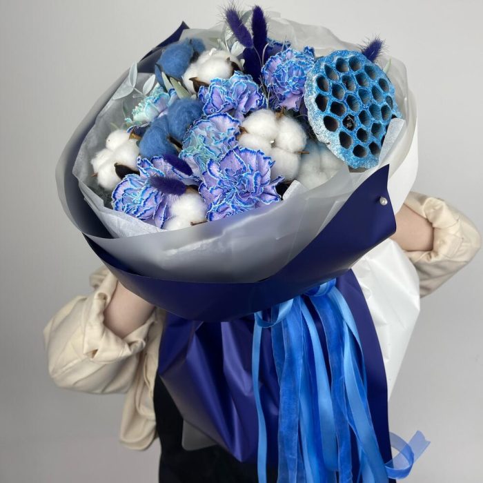 Букет с синими диантусами и лотосом
