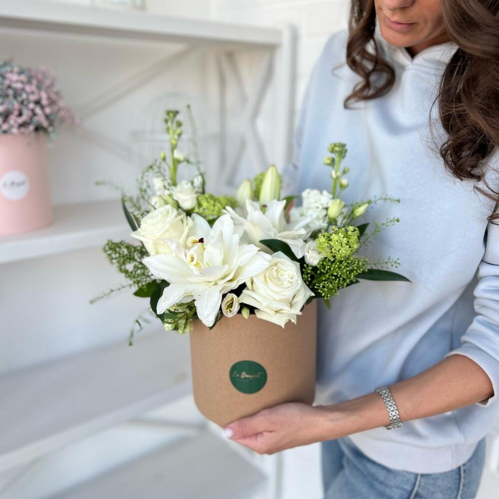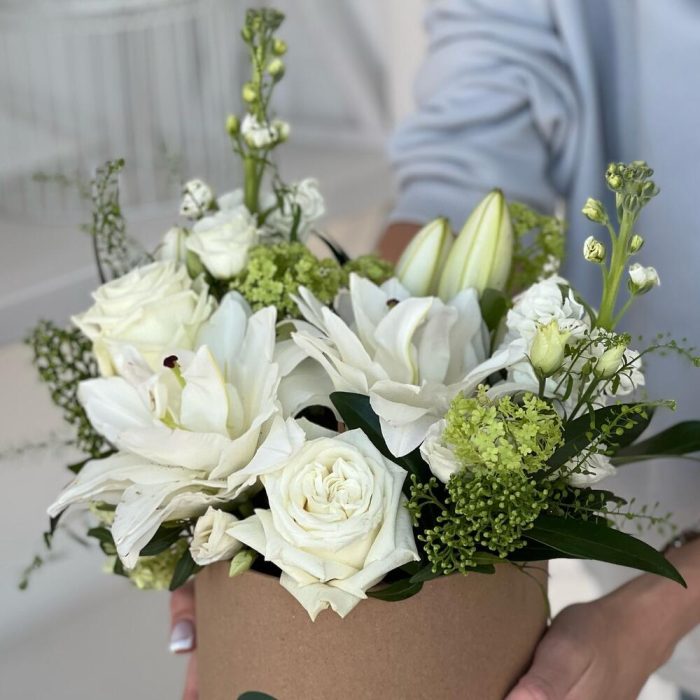 Вибурнум – 3 шт.Лизиантус – 4 шт.Маттиола – 2 шт.Шляпная коробка – 1 шт.Скиммия – 3 шт.Гринбелл – 2 шт.Оазис флористический – 1 шт.лилия дабл – 2 шт.