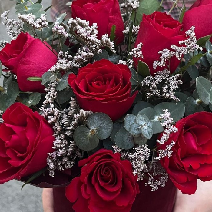 Лимониум – 1 шт.Оазис флористический – 1 шт.Эвкалипт Baby Blue – 4 шт.роза кения красная – 9 шт.шляпная коробка бордовая бархатная малая – 1 шт.