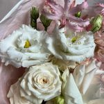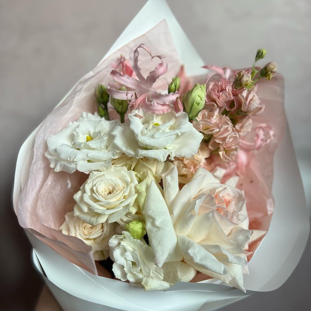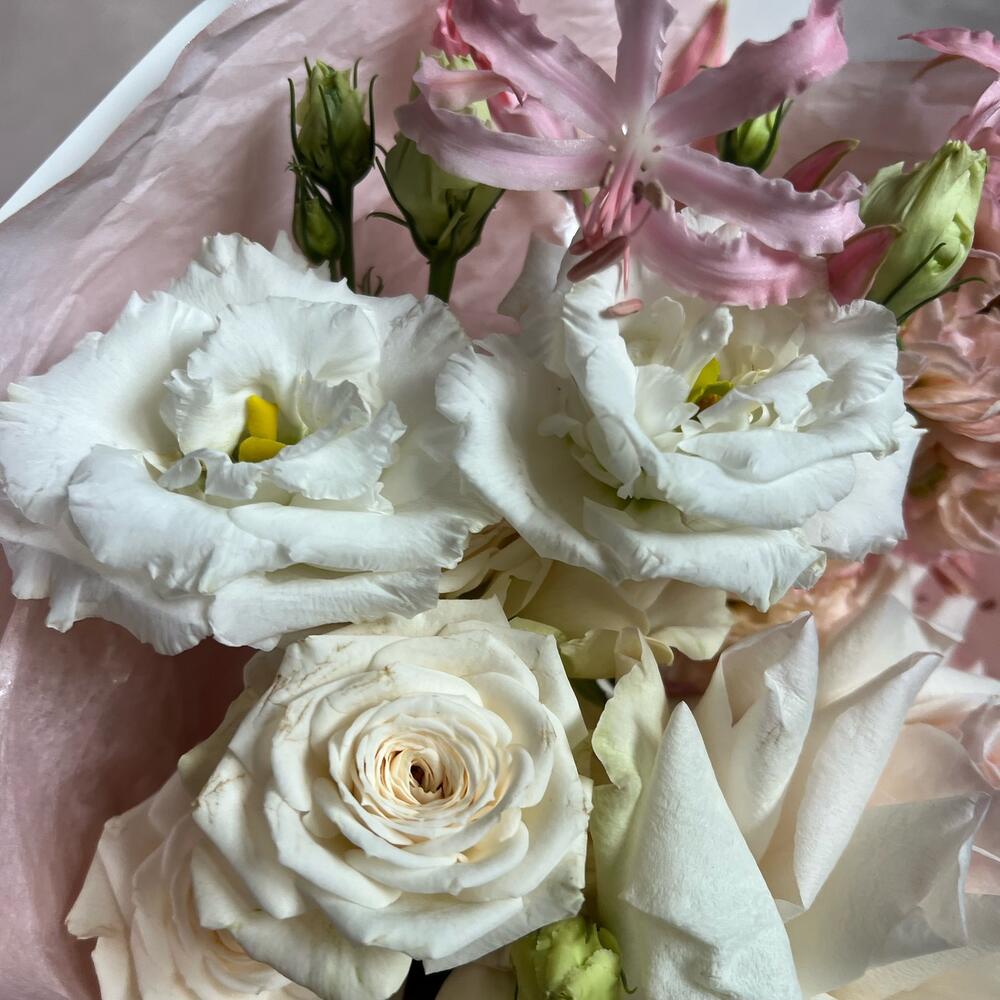Пионовидная роза – 1 шт.Кустовая пионовидная роза – 1 шт.Маттиола – 1 шт.нерина розовая – 1 шт.Лизиантус – 1 шт.декоративная упаковка – 1 шт.Атласная лента – 1 шт.