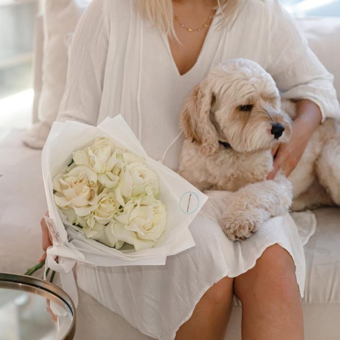 Роза французская – 5 шт.Тишью – 2 шт.Корейская пленка – 2 шт.Лента атласная – 1 шт.инструкция по уходу за цветами – 1 шт.Пакет крафтовый – 1 шт.