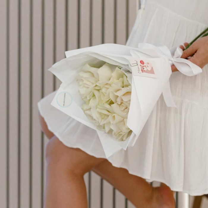 Лента атласная – 1 шт.Тишью – 2 шт.Роза французская – 5 шт.Корейская пленка – 2 шт.Пакет крафтовый – 1 шт.инструкция по уходу за цветами – 1 шт.