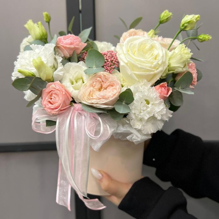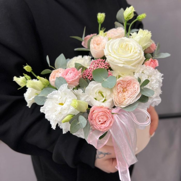 Озотамнус – 1 шт.Эвкалипт – 2 шт.Лента атласная – 2 шт.Диантус – 1 шт.Коробка шляпная – 1 шт.Оазис флористический – 1 шт.эустома махровая белая – 1 шт.роза кустовая мадам бомбастик – 1 шт.эустома розита вайт – 1 шт.роза кустовая пионовидная мэнсфилд парк – 1 шт.роза пионовидная плайя бланка – 1 шт.