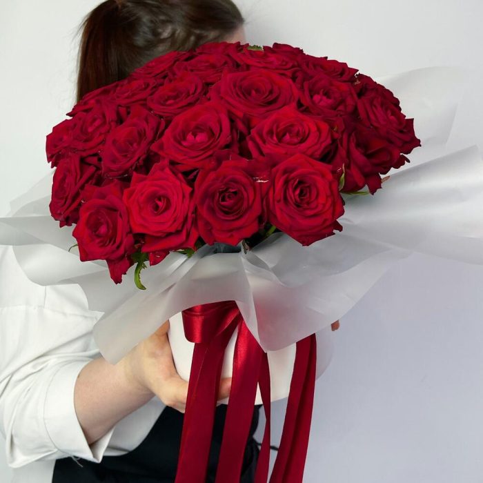 Оазис флористический – 1 шт.Коробка белая – 1 шт.красные розы – 27 шт.