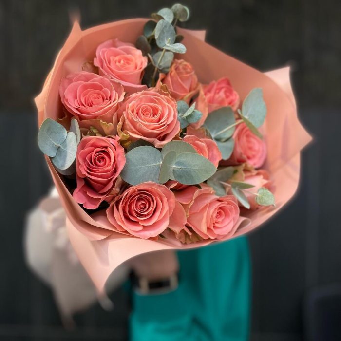 Роза – 11 шт. Эвкалипт – 5 шт. Упаковка дизайнерская – 1 шт.