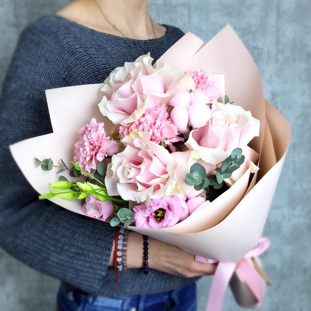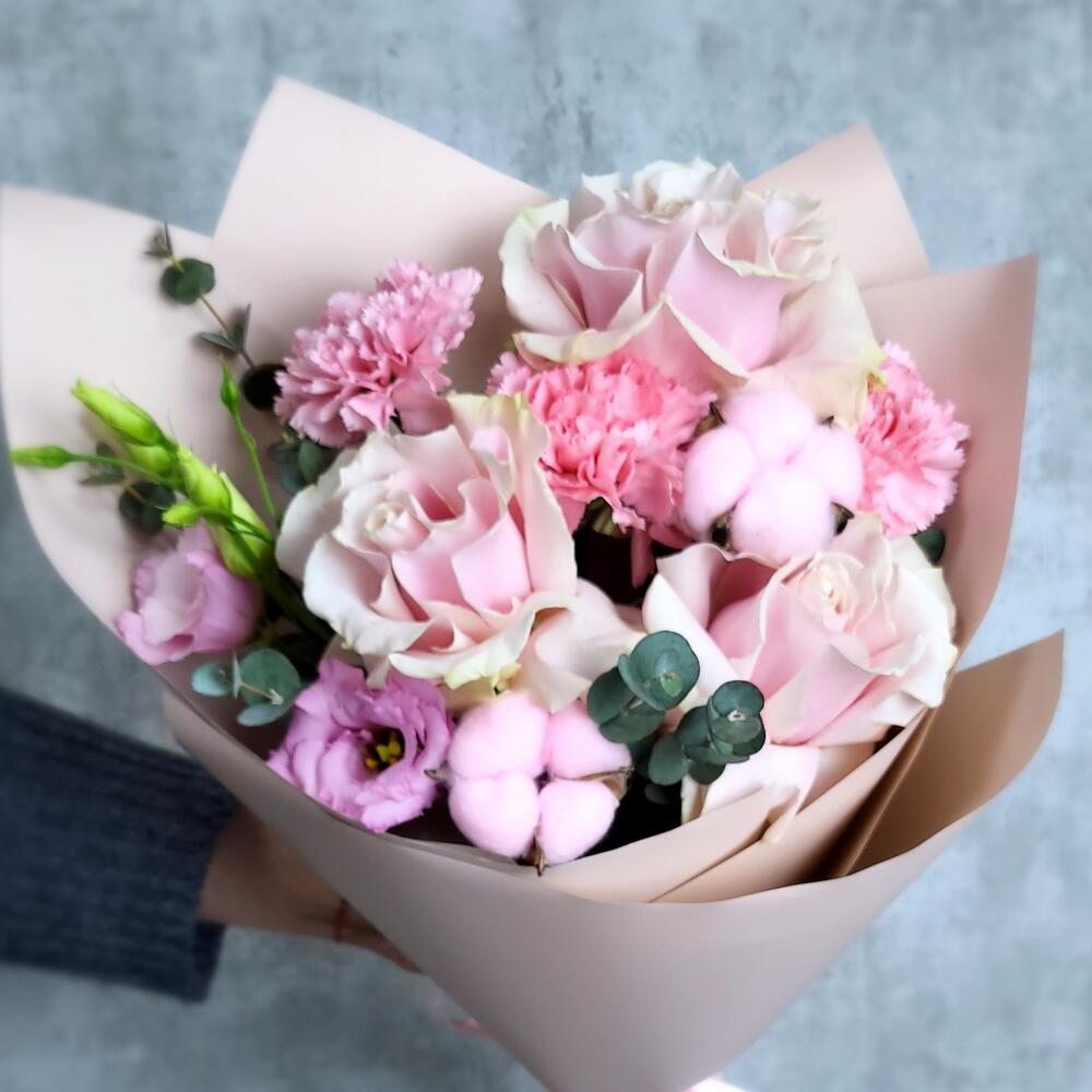 Лизиантус – 1 шт.Хлопок – 2 шт.Эвкалипт – 1 шт.Роза – 3 шт.Гвоздика – 3 шт.